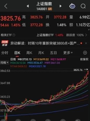 与此同时,在“央妈”呵护下,A股近来屡创新高,初露牛市迹象。今日A股,沪指时隔十年后突破3800点。截至收盘,沪指涨1.45%,报3825.76点,深成指涨2.07%,报12166.06点,创业板指涨3.36%,报2682.55点,科创50指数涨8.59%,报1247.86点。