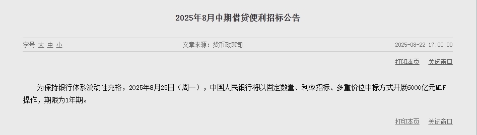 22日收盘之后,央行发布2025年8月中期借贷便利招标公告,为保持银行体系流动性充裕,2025年8月25日(周一),中国人民银行将以固定数量、利率招标、多重价位中标方式开展6000亿元MLF操作,期限为1年期。